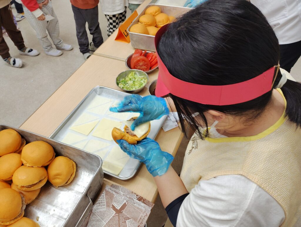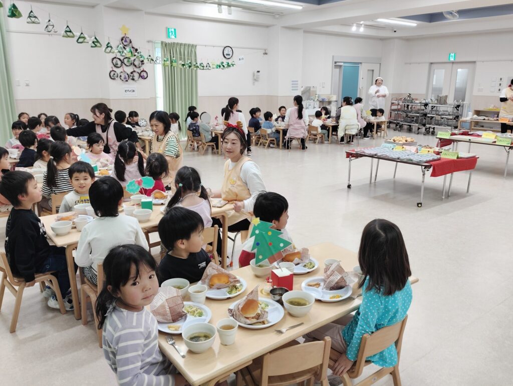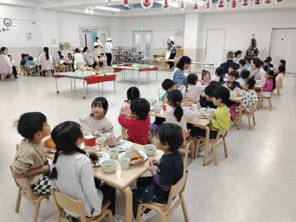 食事は、3.4.5歳児の異年齢でクリスマスバイキング!!今年は給食室の職員がハンバーガー屋さんに変身!楽しみにしていた子どもたちは、ハンバーガーを作ってもらっているときも食べているときもおかわりを取りに行くときも終始いい表情でした☺️